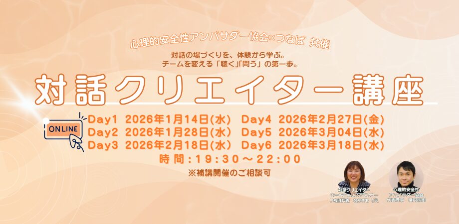 対話の場を作ってみたいがどうしたらいいのかわからない、というお声から『対話の場を創る』をお伝えする講座を心理的安全性アンバサダー協会と共催で開催することになりました!